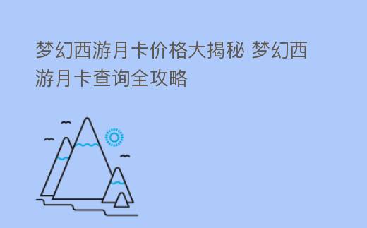 摘要:梦幻西游月卡查询:轻松掌握游戏福利在《梦幻西游》这款经典手机游戏中,月卡作为玩家获取游戏福利的重要途径,一直备受关注。月卡查询不仅可以帮助玩家了解月卡的相关信息,还能轻松购买和激活月卡,享受游戏带来的乐趣。本文将为您详细介绍梦幻西游月卡查询的玩法和解决办法,让您轻松掌握游戏福利。一、,梦幻西游月卡价格大揭秘 梦幻西游月卡查询全攻略
